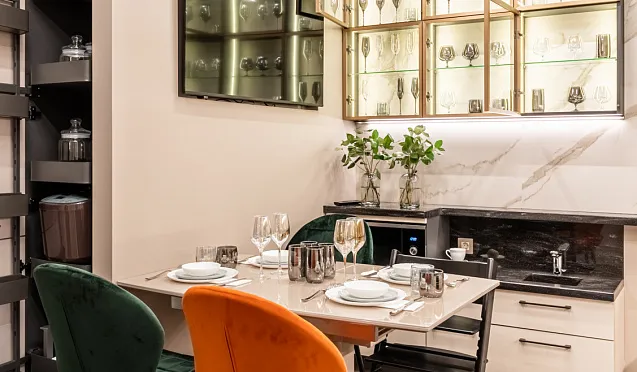 Используя выдвижные системы, вы избавите себя от необходимости покупать лишние контейнеры и лотки для хранения. Все специи, крупы, бутылочки с маслом и, конечно, посуда всегда будут у вас под рукой.