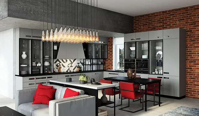 Над обеденной зоной тоже потребуется дополнительная подсветка. Для этого можно использовать светильники на подвесах, люстры, споты. Выбор во многом зависит от дизайна помещения.