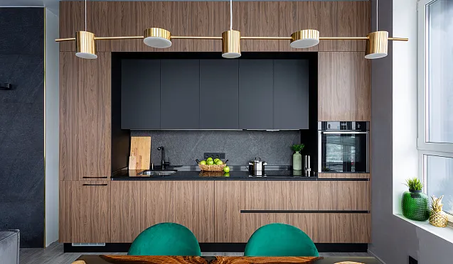 Бытовую технику лучше спрятать за фасадами встроенных шкафов. Благодаря этому приему кухонное помещение визуально будет выглядеть более просторным и свободным.