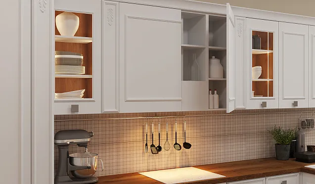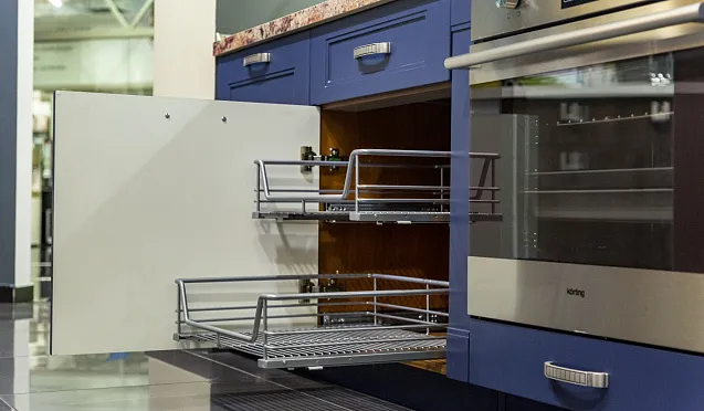 Для использования каждого сантиметра кухонного пространства с пользой рекомендуется использовать угловые шкафы. В свободных углах устанавливают секции для посуды, оснащенные вращающимися полками и выдвижными механизмами. Это позволяет сэкономить место и обеспечивает удобный доступ к содержимому.