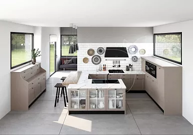 В процессе проектирования кухни может возникнуть соблазн использования фасадов с изысканным декором и витражами. Выглядят они, конечно, интересно, но значительно увеличивают итоговую стоимость комплекта. Гораздо дешевле стоят кухонные гарнитуры с гладкими лаконичными дверцами. Подобные модели по эстетичности не уступают образцам с роскошной отделкой. К тому же минимализм сейчас пользуется особой популярностью.