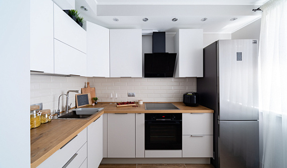 При покупке комплекта обязательно учитывайте его форму. Так, угловая кухня в белом цвете подойдет для помещения средних размеров. Подобная планировка позволяет рационально использовать свободный угол. В него обычно интегрируют полку, мойку или шкаф.