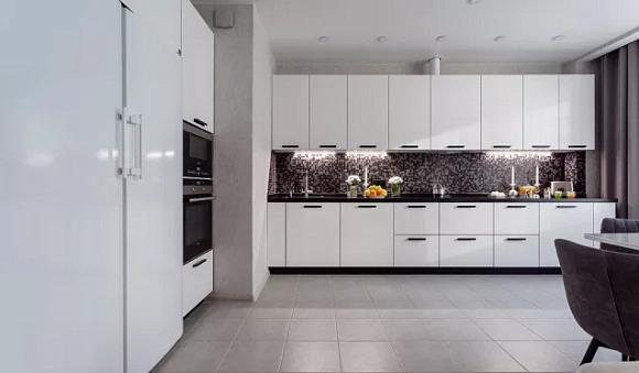 Белый и черный – беспроигрышный вариант для дизайна кухни. Подобное сочетание подойдет для оформления современного интерьера. В небольших пространствах черный цвет можно использовать точечно – в виде фурнитуры, открытых полок или столешницы гарнитура.