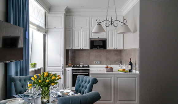 Кухонный гарнитур белого цвета будет смотреться более выигрышно, если оформить его деталями других оттенков. В небольших пространствах лучше использовать вставки светло-серого, голубого или бежевого тона.