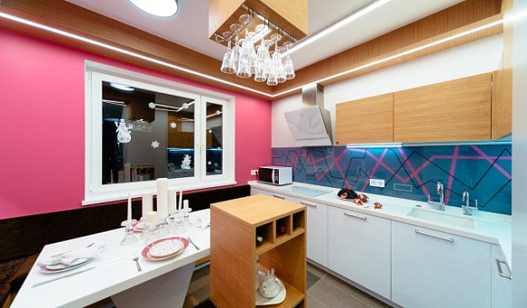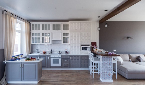 Островные версии обычно используются в загородных омах и квартирах-студиях. Такая планировка позволяет зонировать пространство. К тому же остров можно использовать вместо обеденного стола.