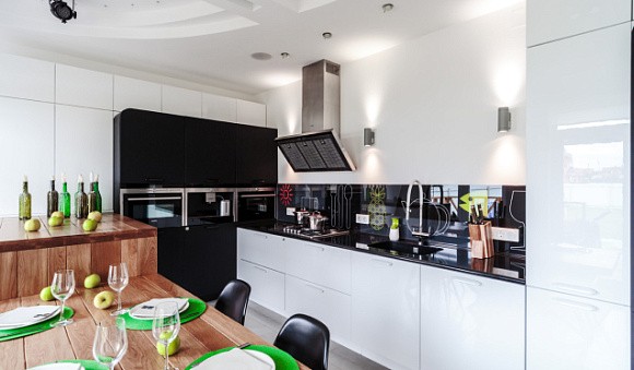 Очень хорошо смотрится белый кухонный гарнитур с темными акцентами. Например, с фурнитурой, столешницей, полками и цоколями черного цвета. Подобные комбинации обычно используются в помещениях больших размеров с хорошим освещением.