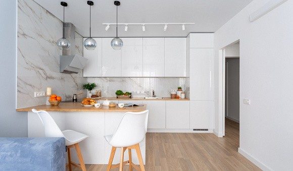 Чтобы кухонная мебель с белоснежными фасадами гармонично встроилась в пространство, используйте при его оформлении советы профессиональных дизайнеров. Например, применяйте в качестве отделки натуральное дерево. Белая кухня с фрагментами из древесины выглядит очень стильно и модно.