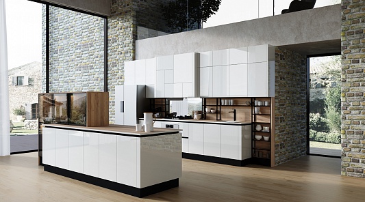 Конфигурация гарнитура может быть любой. В современных интерьерах уместны не только прямые, угловые, но и П-образные белые кухни. Таким образом несложно подобрать модель гарнитура для помещения любой площади и планировки. Для просторных комнат отличным вариантом станут П-образные модели. Их можно устанавливать как в отдельных кухнях, так и в квартирах-студиях.
