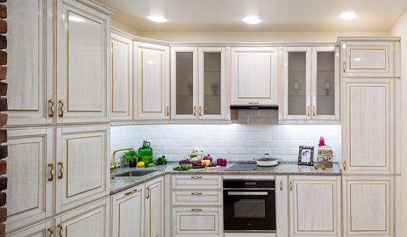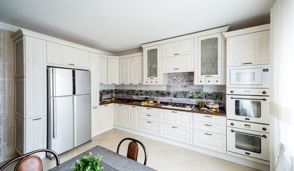 Неоклассические кухни в бежевых тонах выглядят особенно воздушно. С их помощью можно создавать стильные интерьеры, чем охотно пользуются многие дизайнеры. Для кухни в стиле неоклассики характерно использование лаконичного декора в виде вставок из стекла или металла. Также в качестве декоративного оформления применяются точечные светильники и светодиодные ленты. Их устанавливают для подсветки полок и рабочих поверхностей.