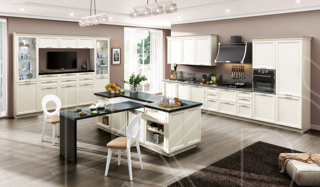 Кухонный гарнитур бежевого цвета с островом отлично подойдет для просторной квартиры-студии. С помощью островной конструкции легко отделить кухонную зону от гостиной. Также ее можно использовать вместо привычного обеденного стола.