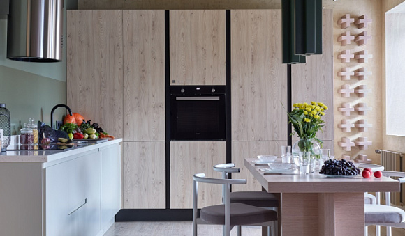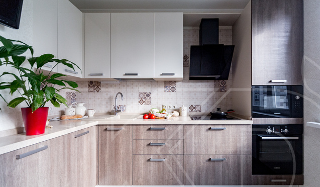 Выбирая бежевый гарнитур, учитывайте его форму, а также архитектурные особенности и размеры помещения, в котором он будет находиться. Так, для небольшой комнаты подойдет прямая кухня с гладкими фасадами. Такой комплект займет место вдоль одной стены, не затенит помещение и не перегрузит его.
