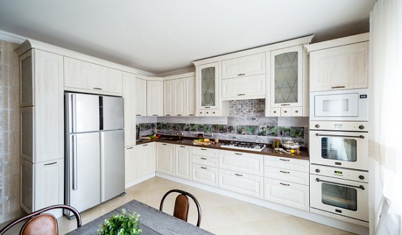 Неоклассическая кухня в бежевых цветах сочетает в себе традиционные и новаторские черты. Подобную модель можно узнать по лаконичным поверхностям, воздушности и легкости. Особенно хорошо смотрятся варианты кухни в стиле неоклассика, в которых глухие фасады комбинируются со стеклянными. Наличие подсветки в таких случаях только подчеркивает изысканность направления.