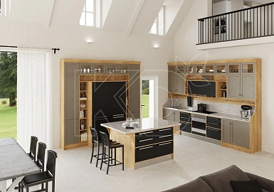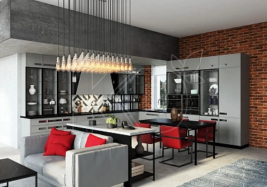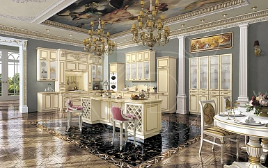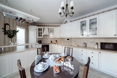 - Размер. Мебель размещается в больших столовых и поэтому имеет большие размеры. Планировка - П-образная или квадратная, обычно с островом. Кухонные гарнитуры более сложные и часто имеют барную стойку или витражные шкафы. Дешевые модели обычно меньше по размеру и имеют линейную планировку.