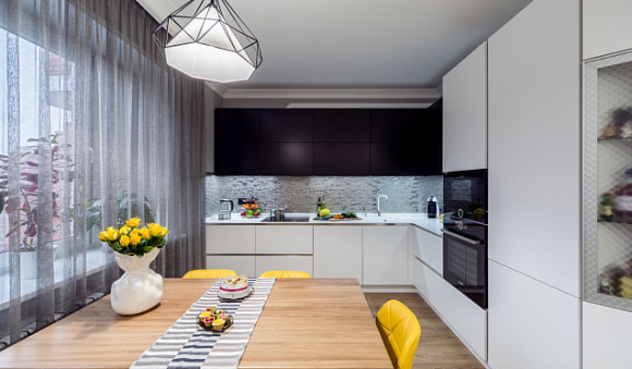 • С белым. Этот цвет избавляет черную кухню от мрачности. Он может присутствовать в виде оттенка пола или потолка, на элементах фурнитуры, фартуке или столешнице. Хорошо в этом комплекте смотрится присутствие белых табуретов, скатерти и светильников. А эффектным штрихом станут шторы. Если геометрия идеальна, пышные занавески не подойдут. Здесь допустимы римские шторы или жалюзи.