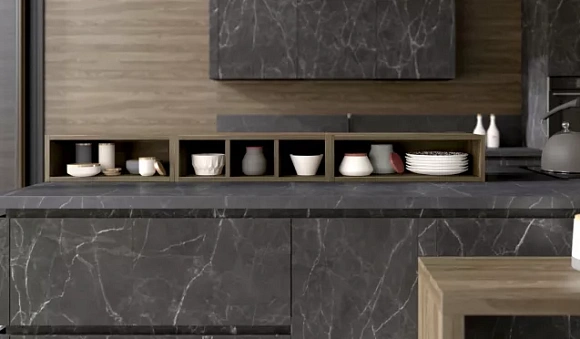 Часто столешницы создают из камня (натурального или искусственного) или массива дерева. Мебель для кухни может дополнять одноцветная отделка серого, бежевого или белого цветов.