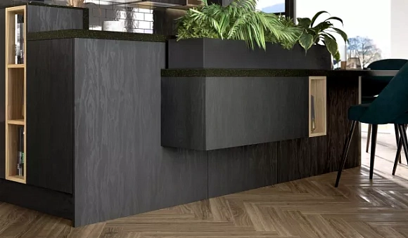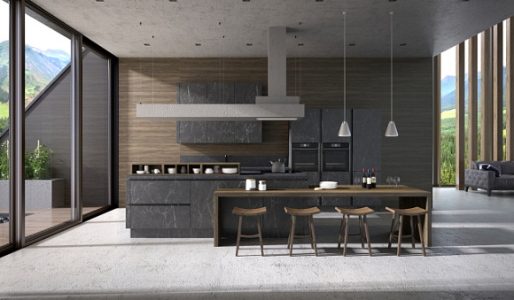 При выборе кухонного гарнитура черного цвета для помещения в стиле лофт важно обратить внимание на матовые поверхности. Не менее красиво, если у фасадов будет видна текстура дерева.