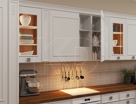 Светлые породы типа ясеня и беленого дуба в сочетании с белыми фасадами выглядят спокойно и невыразительно, но такое решение может подойти тем, кто хочет сделать стены или потолок максимально акцентными и добавить большое количество декора.