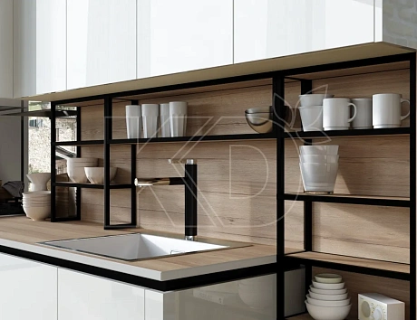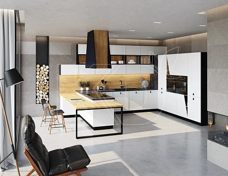 Белая глянцевая кухня с деревянной поверхностью обладает рядом преимуществ: