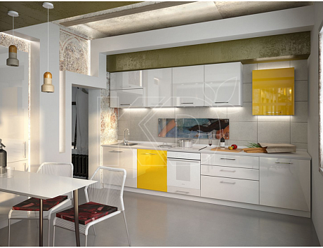 Возможно несколько вариантов оформления такого гарнитура. Он может быть белоснежным, с отдельными вкраплениями желтых элементов, или делиться на два яруса разных оттенков. Обычно верхний ряд шкафов в таком случае выполняют в белом цвете, а нижний – в желтом.
