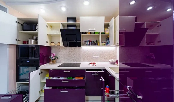Специалисты советуют брать светлые оттенки фиолетового цвета, если кухня крошечная. Чем шире будет помещение, тем лучше в нем будут смотреться более яркие тона. Это правило поможет приобрести подходящий кухонный гарнитур и сделать помещение уютным.