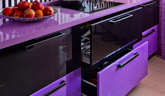 Встретить фиолетовый кухонный гарнитур – большая редкость. Это неординарное решение не пользуется большим спросом у современных хозяек. Они считают его слишком мрачным и таинственным.