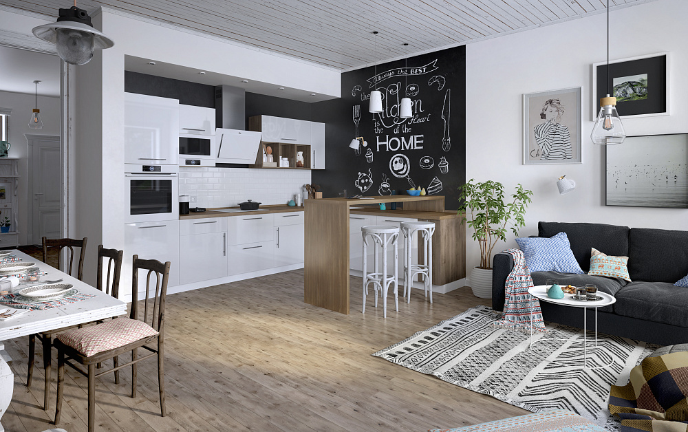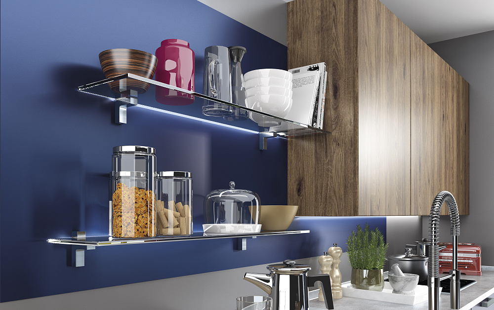Правильное освещение сделает привлекательной даже самую скромную кухню. С помощью светильников можно выделить открытые полки, рабочую и обеденную зону. Для минималистичного интерьера подойдут лаконичные споты. Пространство в стиле лофт можно обыграть лампами на подвесах. Классический дизайн потребует нарядную люстру.