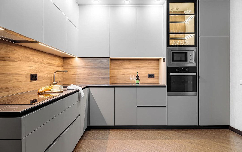 Данное правило в первую очередь касается параллельной и П-образной планировки. Для свободного перемещения между модулями потребуется расстояние 1,2-1,5 метра. В противном случае будет неудобно открывать дверцы шкафов и духовок.
