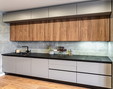 • Линейная. При такой планировке модули расставляют в один ряд возле стены. Это подходящий вариант для небольших комнат, когда важно сохранить каждый сантиметр пространства.