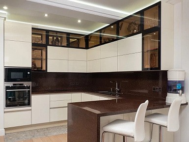 В больших помещениях кухня и гостиная часто оказываются совмещенными. Визуально отделить одну зону от другой можно с помощью островной конструкции, барной стойки или стеллажа. Зонирование с помощью кухни на заказ от производителя технически выполнить гораздо проще. Дело в том, что комплект будет изготовлен с учетом архитектуры пространства.