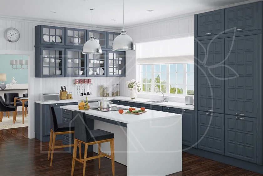 Для отделки фасадов таких кухонь применяется минималистичный декор в виде вставок, филенок, лаконичной резьбы. Геометрические формы сдержанные – прямоугольные или квадратные. Современный модерн предполагает отказ от излишеств и усложненных конструкций.