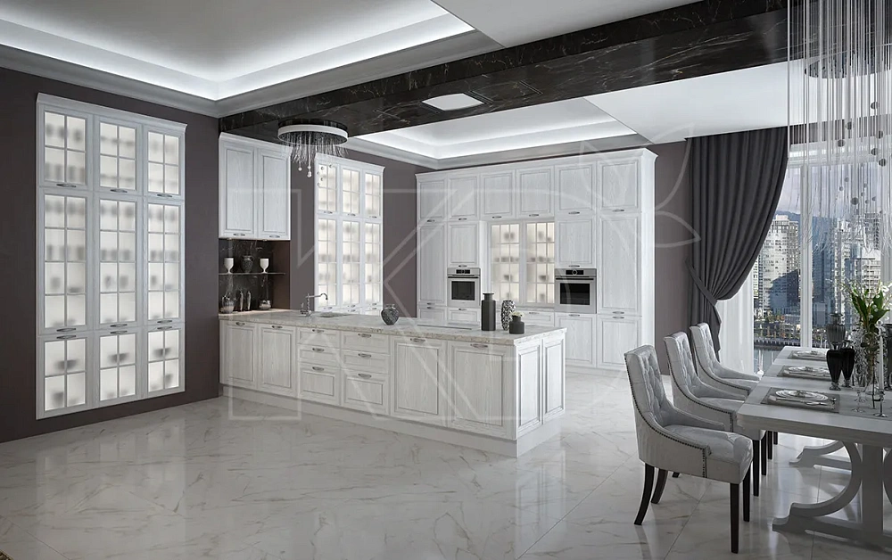 Белый гарнитур может иметь любую планировку, поэтому нужный вариант найдется для любой площади. Для большой комнаты или квартиры-студии подойдет островная модель. С ее помощью можно зонировать пространство. Конструкция в виде острова, совмещает в себе столешницу с варочной панелью и мойкой, иногда и с дополнительными ящиками.