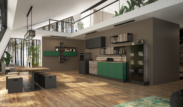 Комплекты в стиле лофт выбирают ценители комфорта и простоты. В этом случае при оформлении помещения используются металлические элементы, кирпичная кладка и декоративная штукатурка. Стиль предполагает некоторую непринужденность, которая выражается открытыми коммуникациями, минимальной отделкой стен. Декоративное оформление фасадов очень скромное – стеклянные или цветные вставки, рамки.