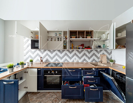 При покупке синего кухонного гарнитура необходимо учитывать площадь помещения. Подобная версия идеальна для больших пространств с хорошим освещением. В этом случае не возникнет ощущения перегруженности и затененности.