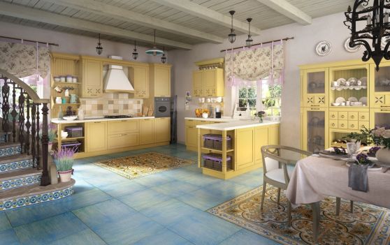 Не менее эффектно выглядят желтые кухни в духе кантри. При этом предпочтение следует отдать именно спокойной, светлой, максимально естественной палитре. Например, песочному, кукурузному или соломенному тону. При этом небольшие яркие вставки будут весьма уместны.