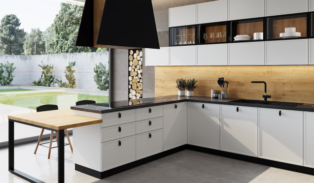 • В зависимости от формы помещения, можно выбрать П-образную, L- образную кухню, чтобы зрительно увеличить пространство, создать хороший обзор в варианте соединения кухни с гостиной.