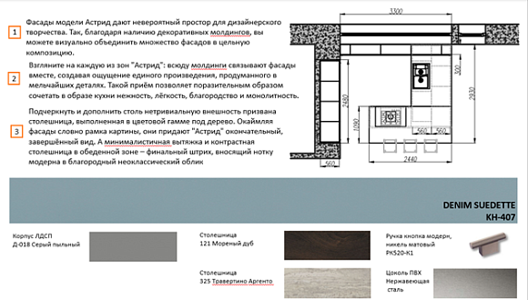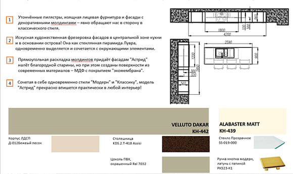 Под кухней «Астрид» подразумевается пространство в помещении, выделенное для приготовления пищи, использования с целью отдыха и комфортного времяпровождения. В современном обществе идеальным становится применение смешения стилей и мебельных композиций, придающих целевое назначение предметам, очерчивающим функциональные зоны кухни.