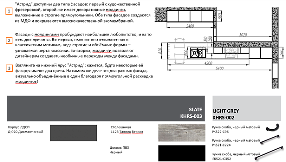 В кухонных гарнитурах Астрид доступны два типа фасадов: первый с художественной фрезеровкой, второй же имеет декоративные молдинги, выложенные в строгие прямоугольники. Оба типа фасадов создаются из МДФ и покрываются высококачественной экомембраной.