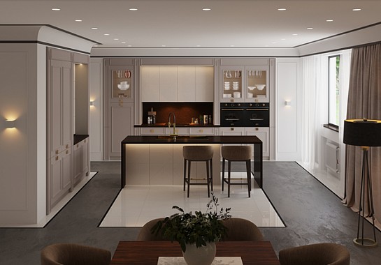 Кухни классика модерн являются отражением богатого внутреннего мира и современной стилистики помещений. Отдельно выделена обеденная зона, место для приготовления пищи.