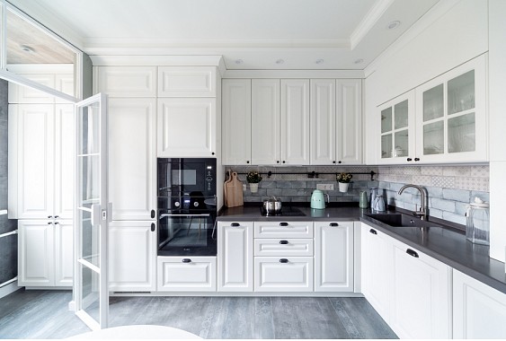 Оптимальная ширина угловой кухни подбирается в зависимости от размеров комнаты. Обычно ширина шкафов варьируется в пределах от 40 до 80 сантиметров. Если вблизи находятся двери, открывающиеся в сторону кухни, их размах не должен превышать 50 сантиметров.