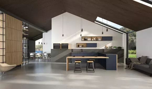 • большая синяя кухня выглядит неуютно.