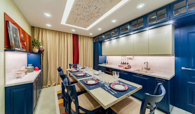 Идеальным дополнением синей кухни или гарнитура в других тонах станет стойла или фарфоровая банка на столе. Темный ковер подарит вам мягкость и комфорт.