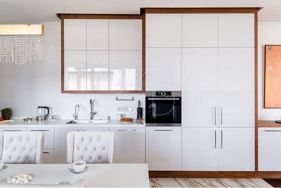 В окружении белоснежных фасадов помещение будет казаться не только больше, но и светлее. Если окна квартиры выходят на затененную сторону, идеальным выбором станет гарнитур с покрытием из ультраглянцевой белой эмали, который будет обладать зеркальным эффектом.