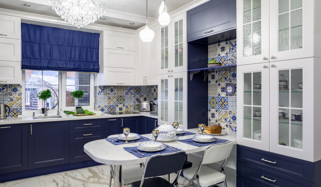Кухонная мебель синих оттенков, дополненный серыми акцентами, притягивает внимание, а пол можно выполнить в любом приглушенном цвете. Если кухня маленькая, то ее стоит разбавить белым цветом.