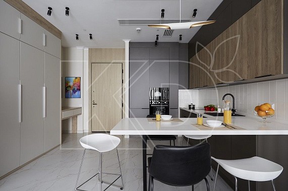 Довольно часто встречаются гарнитуры в стиле сканди с элементами в темных цветах. Например, черными столешницами и навесными полками. Подобные варианты смотрятся очень эффектно. Несмотря на наличие темных деталей, в них сохраняется воздушность и невесомость.