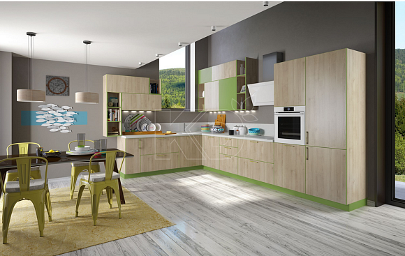 Угловая кухня вместительная и удобная, благодаря такой форме обеспечивается максимум простора на кухне. Угловой кухонный гарнитур гармонично сочетается с барной стойкой или островной столешницей.