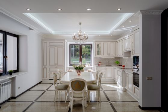 Можно выбрать комнату в едином белом цвете, а можно и в комбинации с другими оттенками. Очень привлекательно смотрится черно-белая и кухня с позолотой. Вкраплений другого цвета может быть совсем немного, но это внесет свою изюминку, добавит изысканности и роскоши.