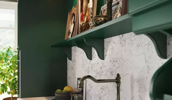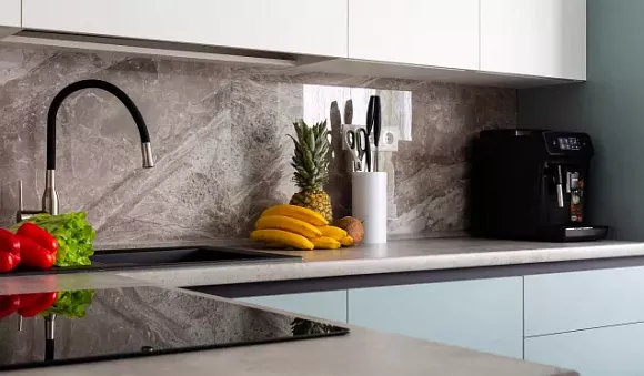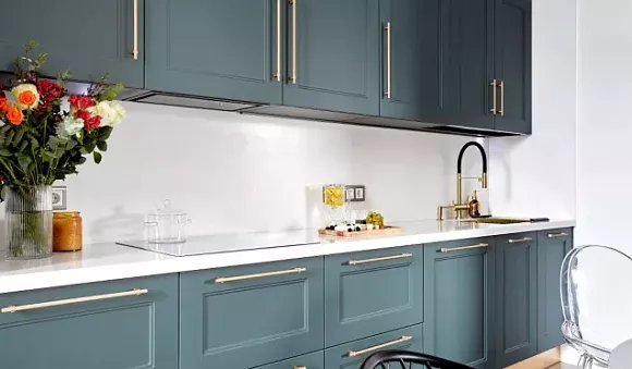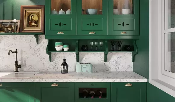 Столешница из натурального или искусственного камня украсит зеленый кухонный гарнитур в стиле кантри или сканди. Для минималистичных моделей можно использовать закаленное стекло, высокопрочный пластик или металл.