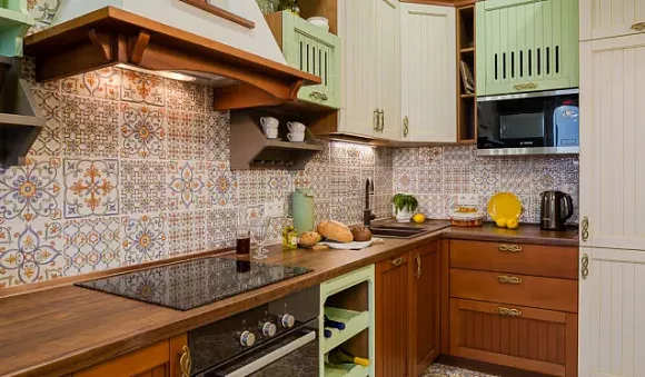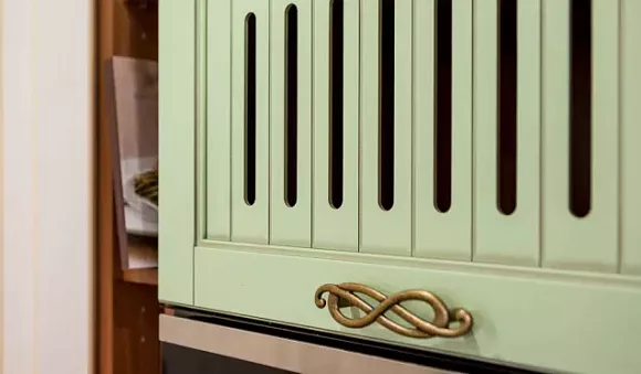 Зеленая кухня в стиле кантри – идеальное решение для загородного дома или дачи. Поверхности кухни кантри выполняют в фисташковом или мятном оттенке. Для их отделки используют молдинги, деревянные решетки.