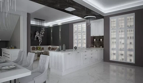 Еще вариант — большую часть декорировать в золоте и выполнить золотые фасады для кухни, отделку стены либо напольного покрытия. В целом, выравнивать соотношение с иными цветами до 1:1. В таком случае рекомендуем воспользоваться услугами дизайнера либо в точности повторить интерьер по фотографии, которые найдены в интернете: лишь таким образом вы можете быть уверены в итоге.