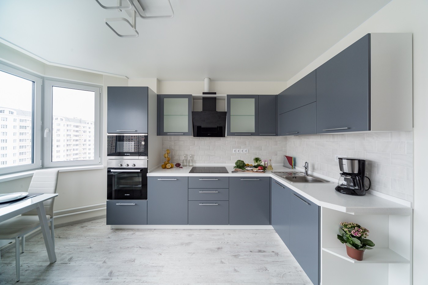 Модель "Фаворит" была выбрана не случайно: дизайн кухни соответствует представлениям молодых о современном мире: динамичном и подвижном. Модель минималистична - глухие фасады выполнены из высококлассного MDF. Удобные и вместительные шкафы оснащены всем необходимым для поддержания идеального порядка, в том числе и встроенной посудомоечной машиной. Отдельный отсек занимает духовой шкаф и микроволновая печь - в правильном питании без них никуда!